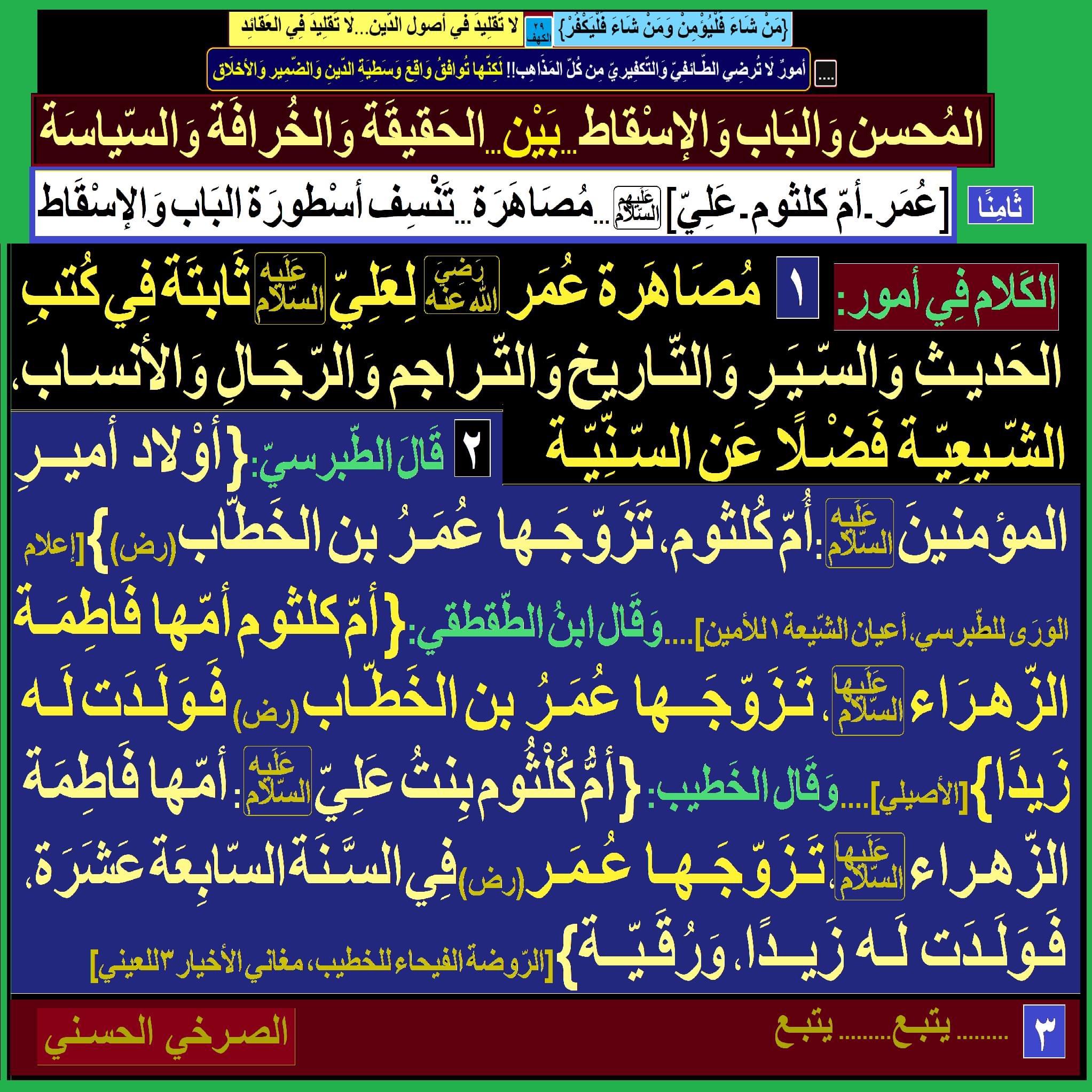 ثامِنًا: [{عُمَر ـ أمّ كُلثوم ـ عَلِيّ}(عَلَيهم السّلام)...مُصَاهَرَة...تَنْسِف أسْطورَة البَاب وَالإسْقَاط]